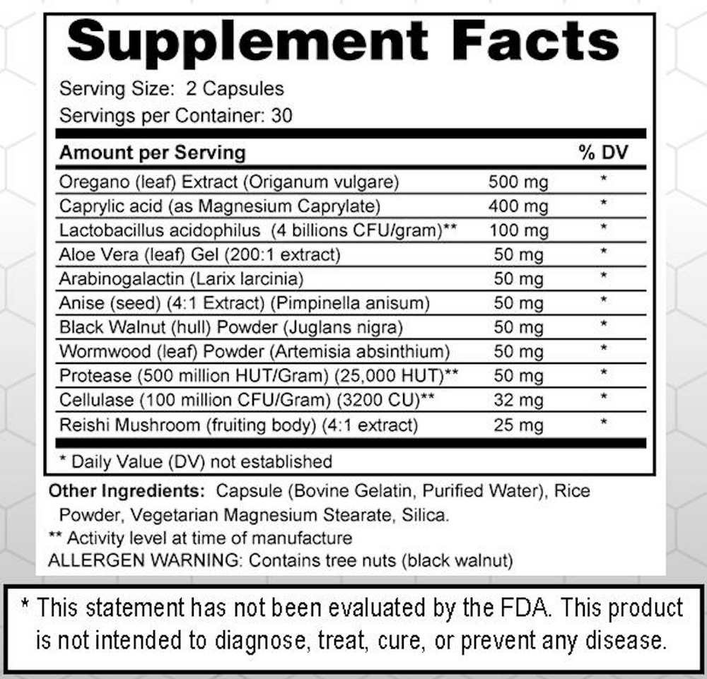 | Black Walnut Hull (50 mg) | Known for antifungal and antiparasitic properties |