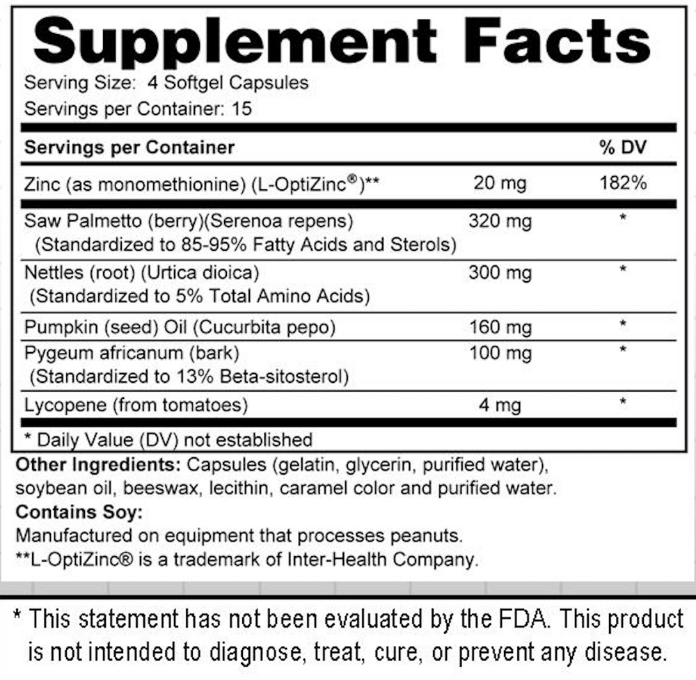 Ingredients: Zinc, Saw Palmetto, Pygeium, Pumpkin seed oil, Nettle Root, Lycopene.